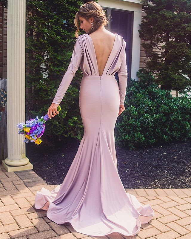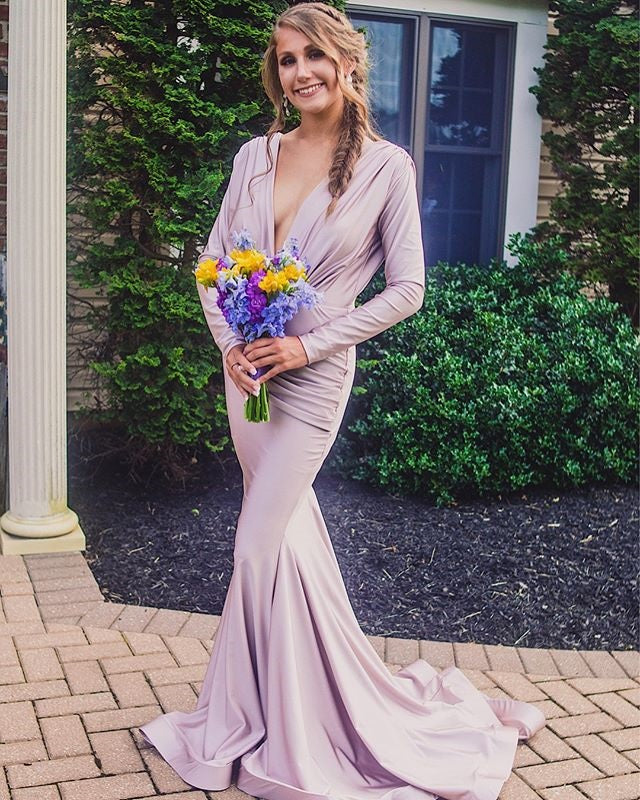 Long Sleeve Deep V-Neck Mermaid Prom Dresses, Soft Satin V-Back Evenin