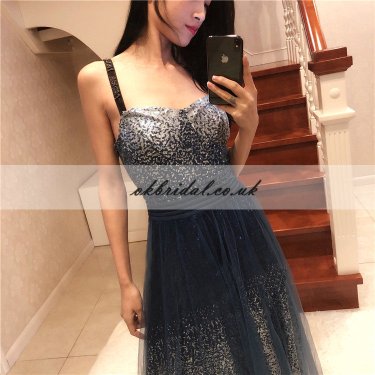 Spaghetti Straps Tulle Prom Dress, Sequin A-Line Prom Dress, Backless