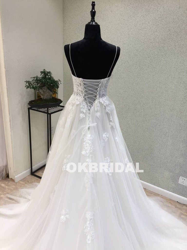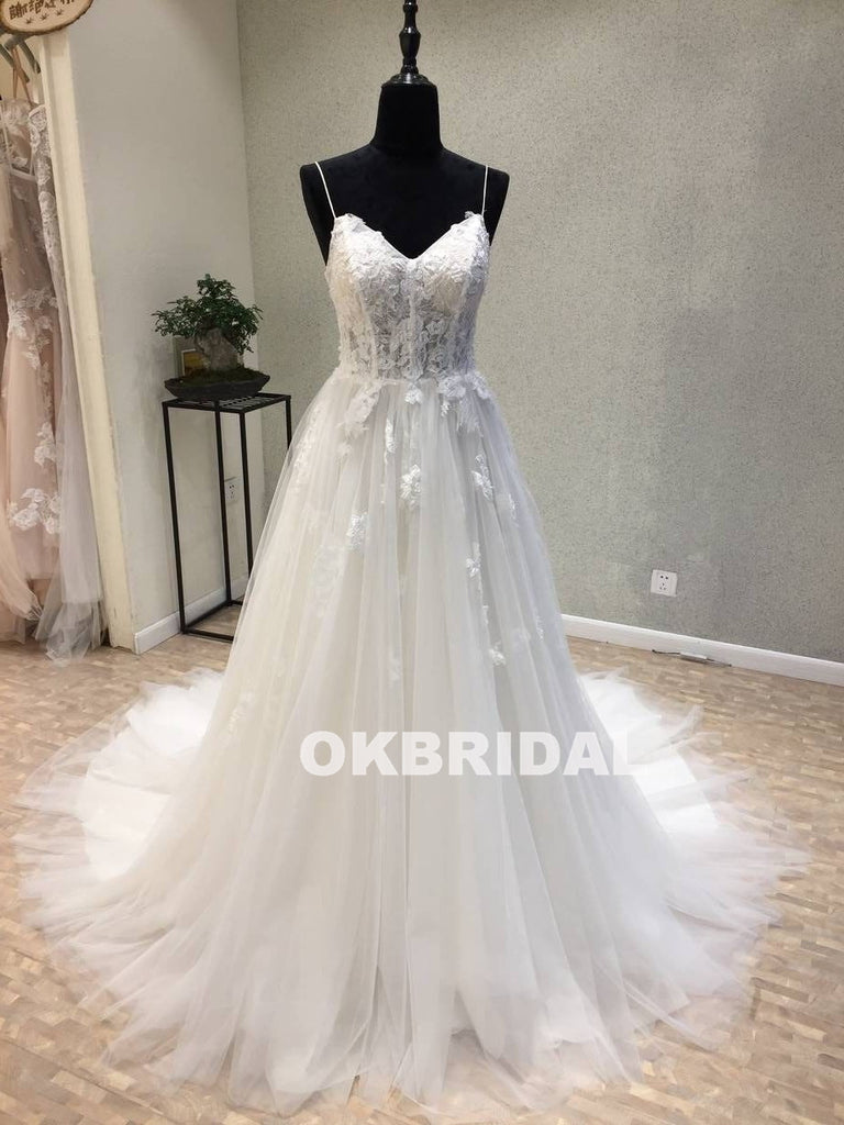 Charming Spaghetti Straps Tulle Wedding Dresses, A-Line Backless Applique Wedding Dresses, KX1087