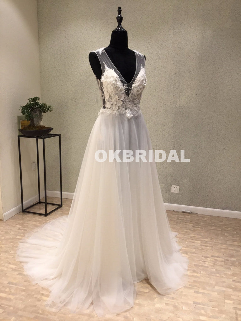 Cheap Tulle V-Neck Wedding Dresses, A-Line Open-Back Applique Wedding Dresses, KX1088