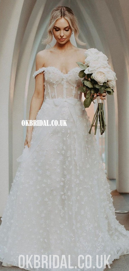 Off Shoulder A-line Charming Lace Backless Floor-Length Wedding Dresses, FC3912