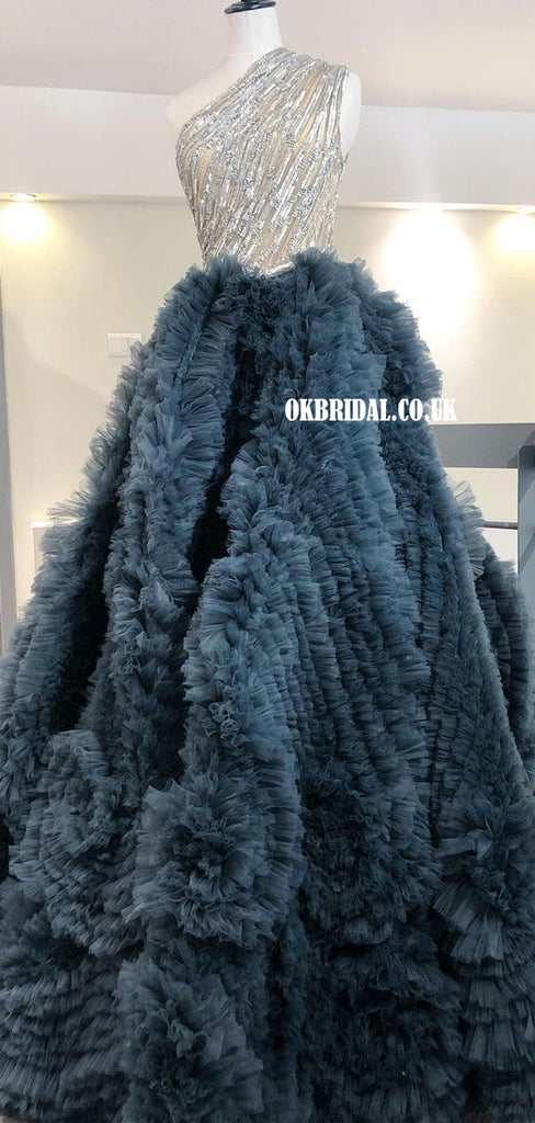 Stunning A-line Tulle One-shoulder Beaded Backless Prom Dresses, FC476