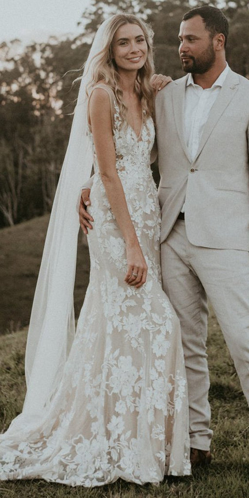 Lace Sleeveless V-neck Backless Long Mermaid Wedding Dresses, FC1862 Lace Sleeveless V-neck Backless Long Mermaid Wedding Dresses, FC1862