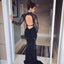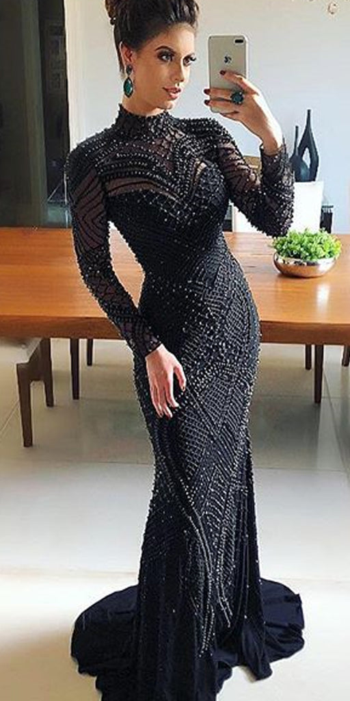 Black Luxury Beaded Long Sleeve Mermaid Open-Back Prom Dress, FC1716