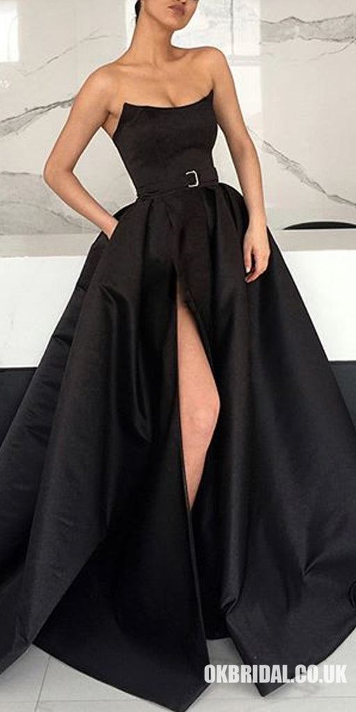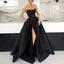 Black Satin Backless Simple A-Line Slit Cheap Long Prom Dresses, FC212