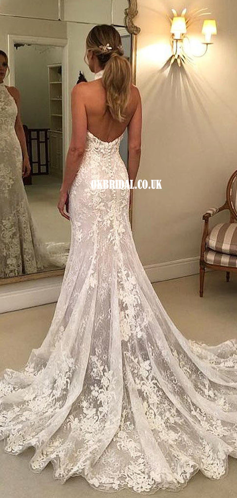 Elegant Lace Halter Backless Mermaid Long Wedding Dresses, FC5863