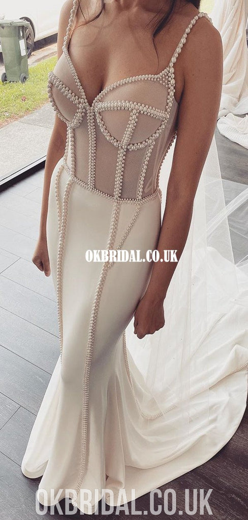 Gorgeous Mermaid Beaded Spaghetti Straps Backless Satin Wedding Dresses, FC4572