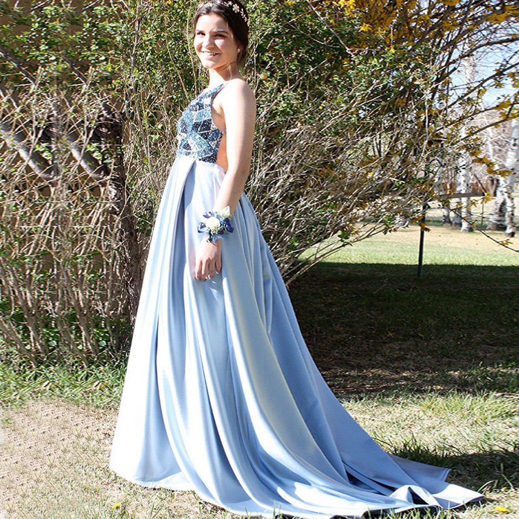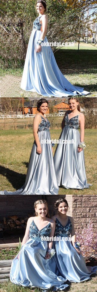 Charming Spaghetti Straps V-Neck Beaded A-Line Satin Backless Prom Dresses, KX1244
