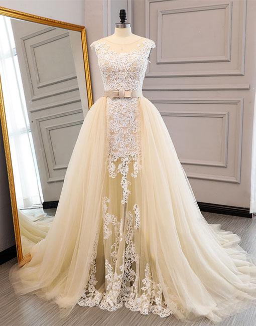 Cap Sleeve A-Line Tulle Prom Dresses, Lace Floor-Length Elegant Prom Dresses, KX258