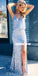 Spaghetti Straps Mermaid Silver Sequin V-neck Sparkle Slit Prom Dresses, FC4173