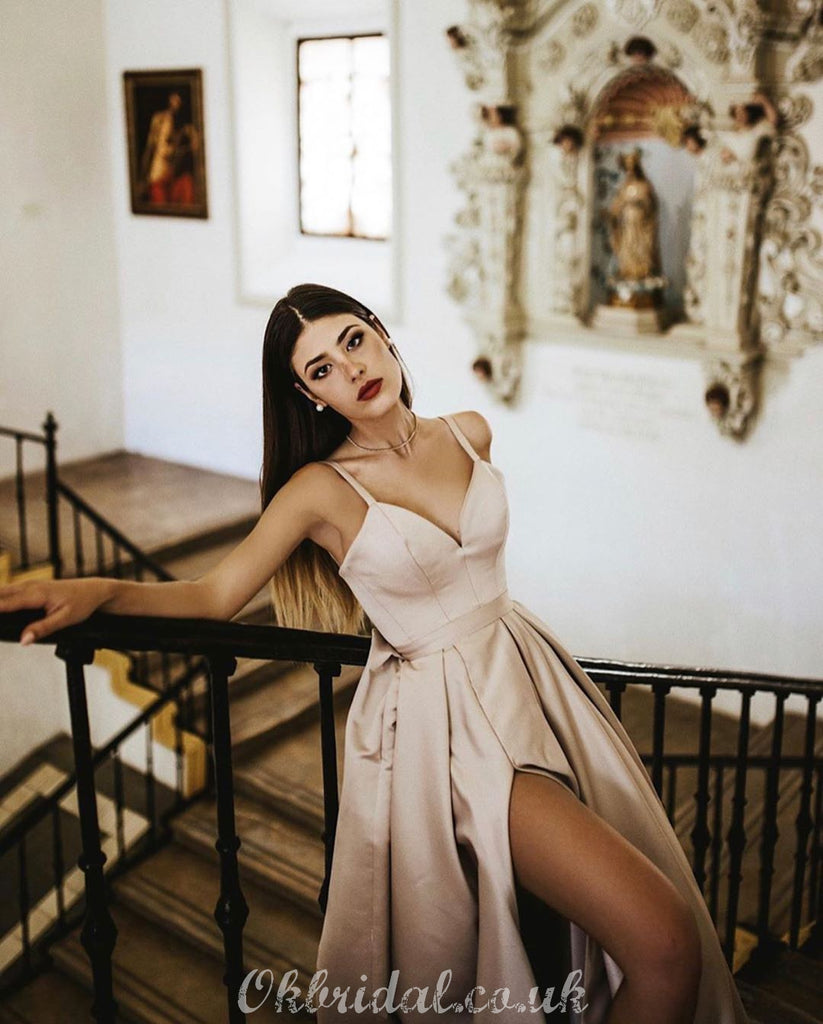 Simple A-line Spaghetti Straps Satin Sexy Slit Prom Dress, FC3759