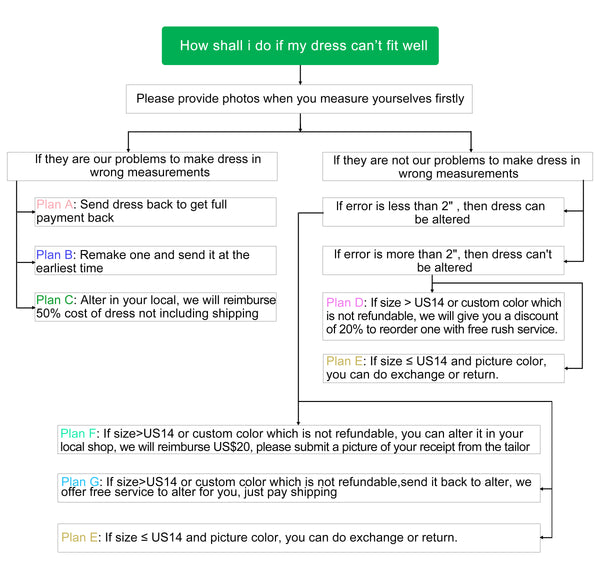 Alteration reimbursements requests must be submitted to us within 1 month of placing your order. After that period of time, we'll no longer be able to process the reimbursement. Please email us: okbridal2017@hotmail.com the photos when you measure yourselves and choose the Plan you like, we are happy to help you.